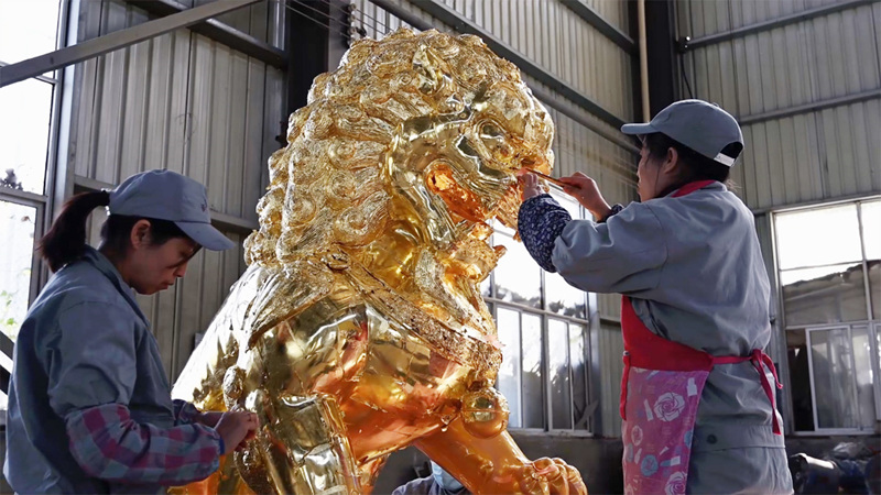 將已刷上金漆的銅獅們全身刷滿特制的金箔膠水